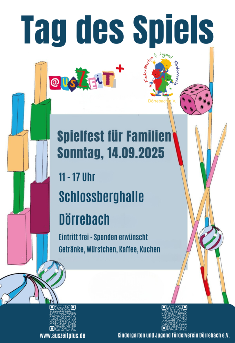 Am Sonntag, den 14.September 2025, lädt ausZeit+ e.V. in Kooperation mit dem Kindergarten und Jugend Förderverein Dörrebach e.V. alle großen und kleinen Spielefans zum Tag des Spiels in die Schloßberghalle Dörrebach ein!